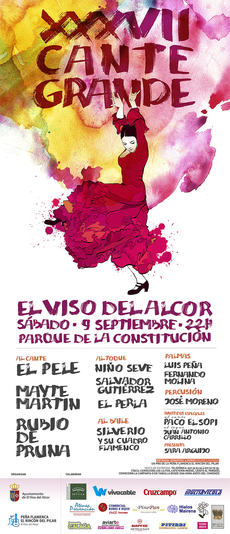 El Pele estará acompañado a la guitarra por Niño Seve, Mayte Martin por Salvador Gutierrez y Rubio de Pruna por el guitarrista El Perla. El baile también tendrá presencia destacada en el festival con el cuadro flamenco de Silverio. La presentación del mismo corre a cargo de nuestra compañera Sara Arguijo.