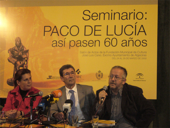 Sesenta años, el pasado 21 de diciembre, cumplió el maestro Francisco Sánchez, más conocido como Paco de Lucía. Sesenta años de vértigo y aventura, de talento y rebeldía. Su cumpleaños emplazó a Málaga en Flamenco para rendirle tributo en su edición de 2007 y, como epílogo, algunos de sus amigos, familiares y secuaces se reunirán en Algeciras para hablar del maestro a sus espaldas, en una iniciativa patrocinada por la Agencia Andaluza para el Desarrollo del Flamenco, las diputaciones de Málaga y Cádiz y el Ayuntamiento de la ciudad que le vio nacer. Hasta Algeciras, por vacaciones, volvía ese eterno niño al que llamaron Mambrú a reencontrarse con sus raíces que también fueron el origen de su angustia y de su magia. En esta localidad y en paralelo a dichas actividades, se exhibirían las exposiciones “Paco de Lucía y los suyos”, de Andrés Vázquez de Sola y “Memoria de Paco”. LUNES 24 DE MARZO DE 2008 19, 30 HORAS. Título: “Paco de Lucía y la música clásica”. 20, 30 HORAS. Intervienen: Ricardo Pachón. Productor discográfico. Modera y presenta: Fermín Lobatón, periodista, crítico flamenco del Grupo Joly y “El País”. MARTES 25 DE MARZO DE 2008 Conferencia de Manolo Sanlúcar, guitarrista. 20, 30 HORAS Mesa redonda: La guitarra, en tiempos de Paco de Lucía Intervienen: Modera y presenta: Mónica Bellido, bailaora y periodista del diario “Sur”. MIÉRCOLES 26 DE MARZO DE 2008 Conferencia de Juan José Téllez, director del curso y autor de dos libros sobre el guitarrista algecireño. Título: Paco de Lucía, en la revolución musical de los años 60 del siglo XX. 20, 30 HORAS José María Bandera, guitarrista, sobrino de Paco, a quien acompañó en algunas giras. Modera y presenta: María Quirós, comunicadora de Canal Sur Radio JUEVES 27 DE MARZO DE 2008 Conferencia de José Luis Ortiz Nuevo, director de Málaga en Flamenco y flamencólogo. Coordinador de la propuesta para que la UNESCO declare al flamenco como patrimonio de la humanidad. 20,30 HORAS Mesa redonda: Paco de Lucía, más cerca. Antonio Sánchez. Hermano de Paco de Lucía. Modera y presenta: Juan José Silva, flamencólogo. VIERNES, 28 DE MARZO DE 2008 Conferencia de Félix Grande, escritor, autor de “Memoria del flamenco” y de “Paco de Lucía, Camarón de la Isla”. Título: “Retrato de Paco de Lucía”. 20, 30 horas. Mesa redonda: alrededor de Paco de Lucía Intervienen: Antonio Fernández Díaz “Fosforito”. Llave de Oro del cante. |