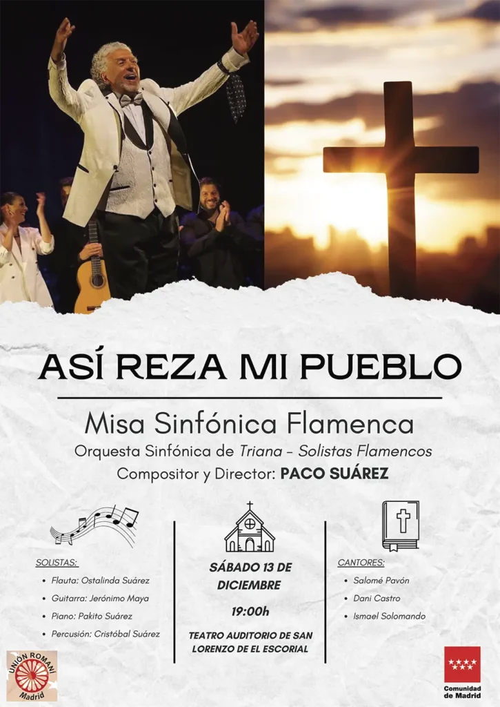 El Teatro Auditorio de San Lorenzo de El Escorial será el escenario del estreno mundial de Así reza mi pueblo, una ambiciosa misa flamenca sinfónica compuesta y dirigida por el músico extremeño Francisco Suárez, que se presentará el 13 de diciembre como parte de los actos conmemorativos del seiscientos aniversario de la llegada del pueblo gitano a España.