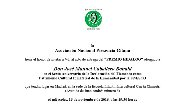 El premio, instaurado por la asociación en el año 1979, premia a José Manuel Caballero Bonald “por su defensa de la causa del Pueblo Gitano, la difusión y enaltecimiento de sus valores, dignidad y cultura en sus investigaciones, publicaciones, estudios y trabajos, y en el discurrir y formulación de sus conocimientos, opiniones y sentimientos al respecto, así como por su decisiva, dilatada, inmensa, humanísima aportación al reconocimiento universal del Flamenco como Arte, Cultura y Modo de Vivir de sus creadores-cultivadores”.