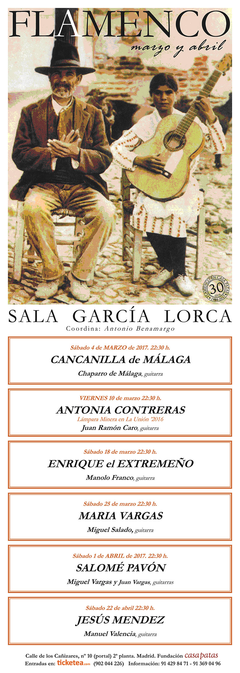 CANCANILLA DE MÁLAGA será el encargado de inaugurar el sábado 4 de marzo, acompañado al toque de Chaparro de Málaga. ANTONIA CONTRERAS última ganadora de la Lámpara Minera ofrecerá su recital el viernes 10 de marzo acompañado a la guitarra de Juan Ramón Caro. El sábado 18 de marzo será el turno para ENRIQUE EL EXTREMEÑO con Manolo Franco a la guitarra. MARÍA VARGAS otra cantaora clásica pasará por la sala el sábado 25 de marzo acompañado por el joven guitarrista Miguel Salado.