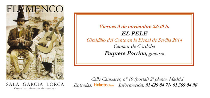 Este fin de semana se abre un nuevo ciclo de conciertos de cante flamenco en la Sala García Lorca de Madrid, abren El Pele -3 de noviembre- y Rubio de Purna -4 de noviembre-.