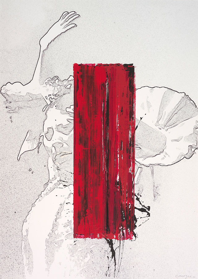 Una fotografía flamenca ha inspirado al autor “He tomado una expresiva fotografía de una bailaora –comenta Canogar- y he tratado digitalmente y dibujado en parte. Una imagen fácilmente identificable del tema flamenco, tomada de nuestro repertorio cultural. Sobre esta imagen es donde he actuado. Una intervención que pretendía que ante todo fuese representativa de mi última obra, de mi pintura… intentando que cumpliese con el cometido que se demanda a un cartel. Una intervención llamativa, un gesto, una acción de pasión, un grito de atención, de agresión violador sobre la imagen flamenca. Un gesto que también pueda ser expresión plástica de su baile o del grito desgarrado del cantaor.”