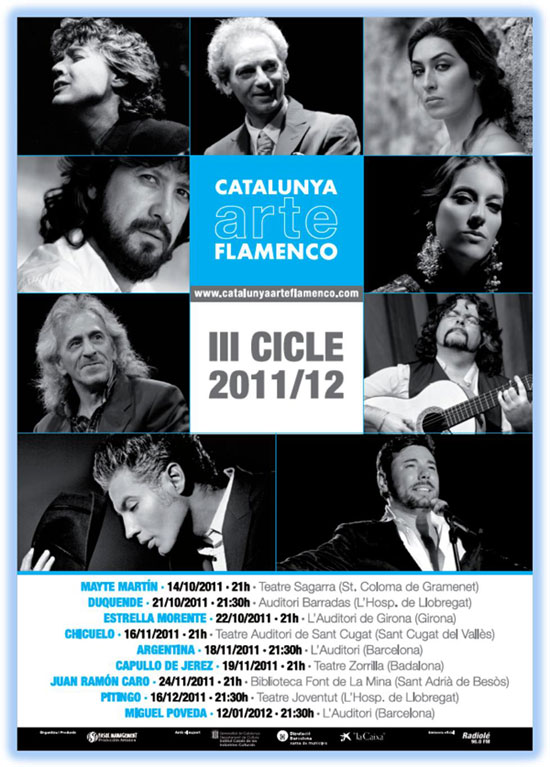 El Ciclo tendrá un especial recuerdo para Enrique Morente que abrió la edición de 2010 el Día de la Mercè en el Gran Teatre del Liceu de Barcelona. Conferencias, mesas redondas y talleres de formación completarán el programa de la tercera edición del Ciclo que tendrá lugar en los próximos meses de octubre, noviembre, diciembre y enero. El III Ciclo Catalunya Arte Flamenco se iniciará el próximo viernes 14 de octubre con un cartel de excepción que reunirá a artistas ya consagrados y a futuras promesas del flamenco actual. Figuras de la talla de Mayte Martín, El Yiyo, Duquende, Estrella Morente, Chicuelo, Argentina, el Capullo de Jérez, Juan Ramón Caro, Pitingo y Miguel Poveda, actuarán en los meses octubre, noviembre, diciembre y enero en diferentes escenarios de toda Catalunya. En octubre el III Ciclo Catalunya Arte Flamenco se abre con las actuaciones de Mayte Martín, El Yiyo, Duquende y Estrella Morente. El mes de noviembre será el turno de Chicuelo, Argentina, el Capullo de Jerez y Juan Ramón Caro, y Pitingo actuará en diciembre. En enero Miguel Poveda pondrá el colofón a la tercera edición de uno de los festivales de referencia del flamenco en Catalunya. En el marco del Ciclo se desarrollarán diversas actividades paralelas como talleres de formación, conferencias y mesas redondas que analizarán el momento del flamenco en Catalunya y la importancia de este arte universal en tierras catalanas desde hace décadas, en este primer año que se reconoce al flamenco como Patrimonio Inmaterial de la Humanidad. Este conjunto de actividades paralelas, que configurarán la parte más didáctica del Ciclo, pretende también dar a conocer a jóvenes y nuevos valores flamencos, así como destacar la labor de promoción y difusión de este arte por parte de las diversas y numerosas entidades culturales andaluzas presentes en Catalunya. |