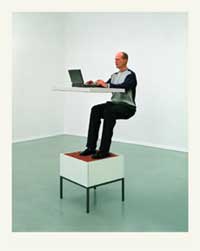 pies como si estuvieran sobre un zócalo y sus manos sobre un escritorio