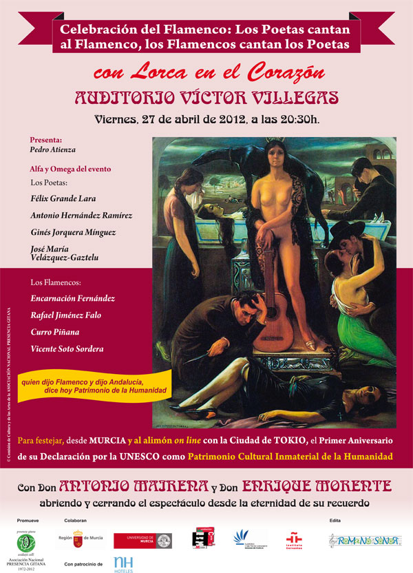 La Asociación Nacional Presencia Gitana, fundada el 15 de febrero de 1972 (que acaba de cumplir, por tanto, los cuarenta años), va a realizar un acto-raíz en el Auditorio Víctor Villegas de la ciudad de Murcia (España) el próximo 27 de abril. Se trata de un evento cultural diseñado para festejar, desde Murcia y con proyección universal, el Primer Aniversario de la Declaración del Flamenco como Patrimonio Cultural Inmaterial de la Humanidad. Pionera, como fue, Presencia Gitana, desde el inicio del año 2001, en la promoción de este reconocimiento, y alcanzado el objetivo concurrente por España en el año 2010, nuestra Comisión de la Cultura y de las Artes se planteó el reto y la necesidad de, inventando tradiciones, planificar la universalización celebrativa del Flamenco por los cuatro puntos cardinales del planeta. Contando con la colaboración de las autoridades culturales del Gobierno Autónomo de Murcia y otras instituciones y entidades, hemos programado la realización del primer eslabón de una cadena de eventos itinerantes, anualmente replicables a escala universal, que arrancará, como decimos, del Auditorio Víctor Villegas de la capital murciana, el 27 de abril, en que tendrá lugar, a las 20:30 horas, la Celebración del Flamenco: los Poetas cantan al Flamenco, los Flamencos cantan los Poetas. Enlace a la web del Auditorio, a través de la cual se pueden adquirir las entradas: Este acontecimiento cultural trascendente ya está generando un interés y una expectación prometedores. Será transmitido on line, por el Instituto Cervantes, y proyectado en todos los Centros que la primera institución para la difusión de las Culturas de España tiene repartidos por el mundo, a través del Centro Virtual Cervantes y del Canal Cervantes TV. Le adjuntamos el cartel del espectáculo, en el que participará un elenco de los más significativos poetas españoles y de artistas flamencos de la actualidad. Desde la perspectiva de su visibilidad, de su impacto regional y nacional, y de su alcance internacional, no quisiéramos dejar de mencionar el plus de oportunidad solidaria que acompaña al acontecimiento que hemos diseñado por su especial y entrañable dedicatoria: “Con Lorca en el Corazón”. Es una llamada a la continuidad del trabajo asociativo de Presencia Gitana, volcado en un proyecto de desarrollo comunitario integral para articular remedios dignos y definitivos a los problemas de los más desfavorecidos de los damnificados por el terremoto del 11 de mayo del pasado año. |