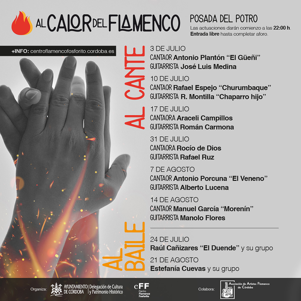 La sede del Centro Flamenco Fosforito prolongará así su programación de recitales durante los meses de julio y agosto con un programa de actuaciones que ha sido elaborado en colaboración con la Asociación de Artistas Flamencos de Córdoba y que contará con la participación de una veintena de artistas cordobeses en las disciplinas de Baile, Guitarra y Cante.