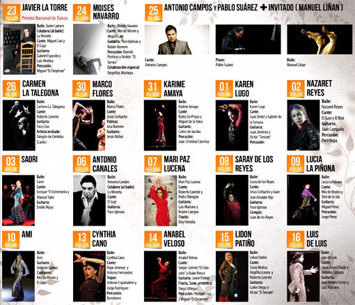 El programa cuenta con figuras del baile consagradas como Javier Latorre y Antonio Canales, que comparten cartel con artistas tan relevantes en el panorama flamenco actual como el bailor granadino Manuel Liñán, artista invitado en el espectáculo del cantaor Antonio Campos y el pianista Pablo suárez. Otros nombres de jovenes bailaores como Marco Flores, Karen Lugo, La Piñona, Anabel Veloso, Lidón Patiño… las bailaoras niponas, Saori y Ami, además cuenta con la reaparición de la bailaora Maripaz Lucena que da la imagen al cartel de este año. Paralelo al programa y en colaboración con éste, se realizarán los cursos que desde hace cuatro años vienen realizando El Carmen de las Cuevas, sumándose también por primera vez la Escuela Internacional de Flamenco del maestro Manolete en la Chumbera.