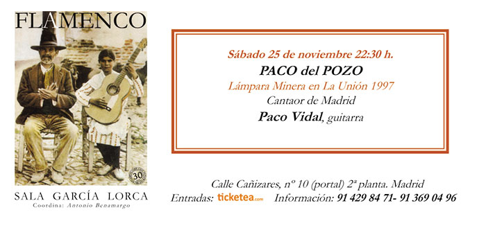 El sábado, el madrileño Paco del Pozo, ganador de la Lámpara Minera en el año 1997, llega acompañado por su guitarrista habitual Paco Vidal, con el que ha grabado recientemente su segundo trabajo discográfico titulado “En este momento”.