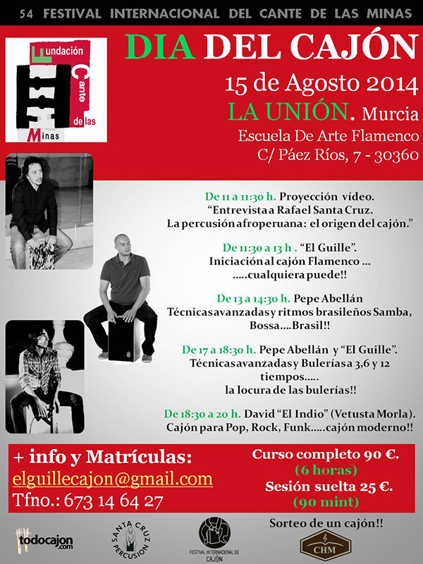 El más reciente es el que tendrá lugar en la 54 edición del Festival Internacional de las Minas en La Unión donde se desarrollaban 3 eventos de los cuales el primero, por razones obvias, se ha suspendido pero los otros dos donde Rafael y yo compartíamos la dirección de los mismos se van a llevar a cabo por deseo de la familia y mío personal por el vínculo que me unía a este artista genial. El primero era un concierto de música afro peruana el día 14 de agosto que se ha suprimido, el segundo, el “Día del cajón” se celebrará el 15 de agosto donde se comenzará con la proyección de una entrevista a Rafael en el festival de cajón “Tókalo” hace 2 años para dar luego paso a todo un día lectivo dedicado al cajón (adjunto cartel) y la Gran Cajoneada el 16 de agosto dedicada a Paco de Lucía y Rafael Santa Cruz .