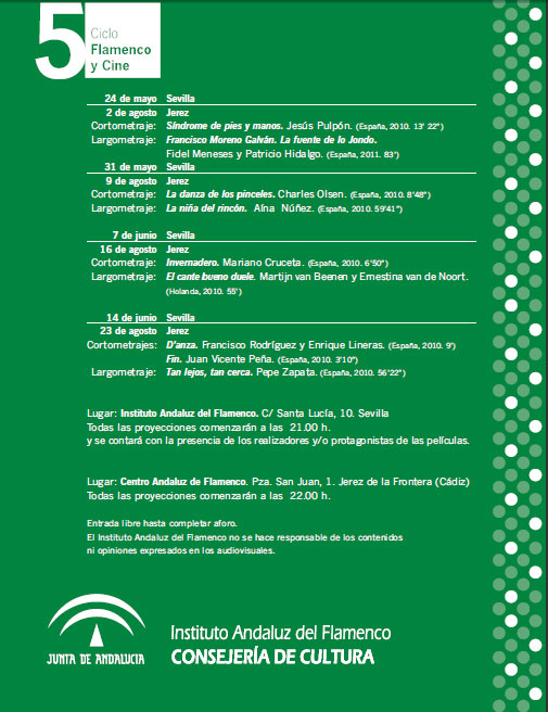 El Centro Andaluz de Flamenco acogerá a partir del próximo martes, 2 de agosto, una nueva edición de ‘Flamencine de Verano’, el ciclo de proyecciones cinematográficas que cada verano convierte el patio trasero del Palacio Pemartín en sala de cine. Se celebra este año su quinta edición, que se desarrollará durante los martes del mes de agosto. A partir de las 22.00 horas, los aficionados al cine y amantes de lo jondo podrán disfrutar de cuatro proyecciones -una por semana- cuya temática gira en torno al flamenco. En esta nueva edición, el ciclo mantiene el formato de proyección en el patio trasero de la sede del Centro Andaluz de Flamenco pero tiene una novedad: previo a cada largometraje se proyectará un cortometraje de los que participaron en el primer Festival Internacional de Cortometrajes Flamencos, que tuvo lugar en 2010. Se trata de los tres primeros premios otorgados en dicho certamen y dos cortometrajes de realizadores andaluces que también participaron en él. El programa, que se desarrolló en Sevilla entre mayo y junio con éxito de convocatoria entre los aficionados, será el siguiente: 2 de agosto, Síndrome de pies y manos, de Jesús Pulpón, y Francisco Moreno Galván, de Fidel Meneses y Patricio Hidalgo iniciarán los cuatro martes de cine en la iglesia de Santa Lucía. Le seguirán La danza de los pinceles, de Charles Olsen y La niña del rincón, de Aína Núñez el 9 de agosto; Invernader, de Mariano Cruceta y El cante bueno, duele, de Ernestina Van der Noort y Martjin van Beenen el 16 de agosto. La última jornada de cine tendrá sesión doble de cortometrajes, con D'anza de Enrique Lineras y Francisco Rodríguez y Fin, de Juan Vicente Peña y Tan lejos, tan cerca, de Pepe Zapata. Además, el Centro Andaluz de Flamenco está acogiendo en esta semana parte de los cursos programados en el proyecto 'Flamenco en el Este' que organiza la asociación cultural La Argentinita y coordina Inma Lobato y que cada año celebra varios seminarios en Eslovenia y Bosnia. Desde el pasado lunes y hasta el día 29, las mujeres de las asociaciones culturales eslavas que participan en el proyecto están en Jerez de la Frontera participando en un seminario multidisciplinar que incluye clases de baile y de toque, proyecciones específicas de películas flamencas, conferencias y recitales. El proyecto persigue la difusión del Flamenco en los países del Este, desde el baile jondo a las costumbres, la indumentaria, la historia, el folklore, la gastronomía andaluza, que lo acompañan culturalmente a través de diferentes actividades. Así mismo, mediante las clases, se fomentan las relaciones afectivas, y sociales de estos países y se consigue que las distintas etnias creadas a partir de la guerra vuelvan a relacionarse como lo hacían antes del conflicto. PROGRAMACIÓN. 9 de agosto 16 de agosto 23 de agosto Lugar: Centro Andaluz de Flamenco. Palacio Pemartín. Plaza San Juan, 1. Jerez de la Frontera. |