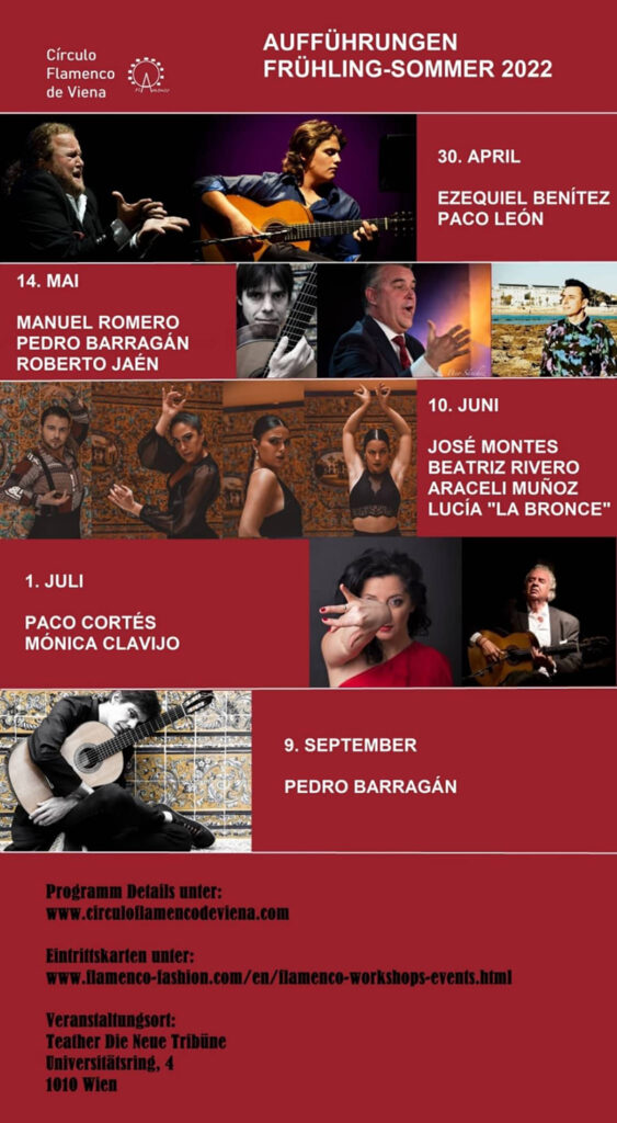 A partir del 30 de abril habrá flamenco cada mes en el teatro «Die Neue Tribüne» en el centro de Viena. Se presentarán diferentes visiones del flamenco, pero no sólo se experimentará como público. Los artistas invitados también impartirán clases magistrales, cursos y conferencias, para que todos los amantes del flamenco en Viena puedan vivir esta pasión y profundizar en sus conocimientos.