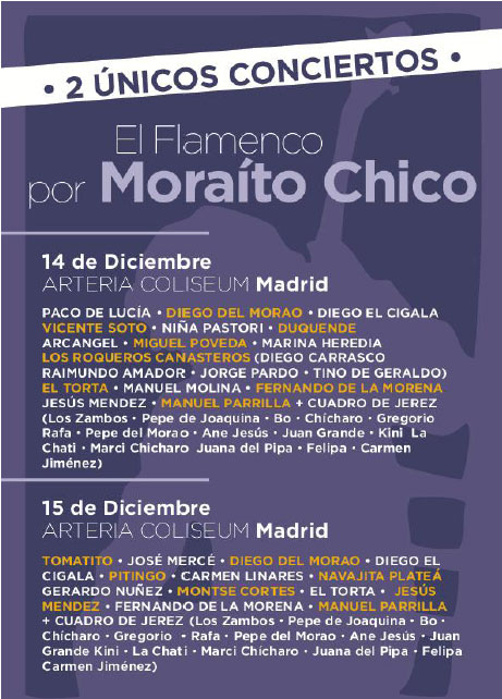 | Serán tres fechas, una en Jerez el 18 de noviembre, en el Palacio Municipal de Deportes de Chapín en el que participarán artistas como José Mercé, Miguel Poveda, Lebrijano, Macanita,… (ver cartel completo). En Madrid, los días 14 y 15 de diciembre en el Teatro Arteria Coliseum se convertirá en el acontecimiento flamenco del año, dos días para poder dar cabida a todos los artistas que se suman al homenaje. El maestro Paco de Lucía será el abanderado de este homenaje en Madrid que cuenta con Diego el Cigala, Vicente Soto, Duquende, Arcángel, Tomatito, José Mercé, El Torta… (ver cartel completo).