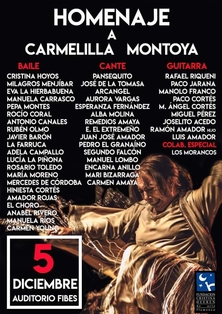 “Ya se ha cumplido mi tiempo y me retiro de los escenarios”. Carmelilla Montoya se despide de la vida profesional por motivos de salud. Pero lo hará recibiendo el homenaje de más de medio centenar de artistas, con los que compartirá una gala especial en el Auditorio Fibes de Sevilla el próximo 5 de diciembre a las 21:00 horas. Algunos de ellos la acompañaron en la presentación del cartel ante los medios, un acto celebrado en el teatro de la Fundación Cristina Heeren, entidad que colabora con este espectáculo solidario. Eva Yerbabuena explicó que “Carmen es una mujer con fuerza, un ejemplo para todos”. A lo que añadió que “los flamencos no sólo nos unimos para rendir tributo a una trayectoria profesional, pues lo que hace grande a un artista es ser persona”. En el mismo sentido se pronunciaron la bailaora Milagros Menjíbar, la cantaora Aurora Vargas, el guitarrista Pedro Sierra y, con un vídeo-mensaje, el bailaor y coreógrafo Rubén Olmo, actual director del Ballet Nacional de España, que colaborará en la dirección escénica. Y son sólo algunos de los muchos bailaores, cantaores y guitarristas que respaldarán a la bailaora, cantaora y profesora trianera en la gala que, como resumió Cristina Heeren, será “una celebración de la vida artística de un símbolo del arte de Triana”.