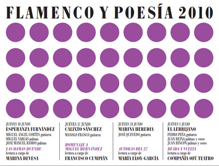Artistas como Esperanza Fernández, Calixto Sánchez, Marina Heredia y el Lebrijano unen el flamenco a la poesía con artistas literarios como Marina Devesa, Francisco Cumpía, María Eloy-García y la Compañía Ofú Teatro.