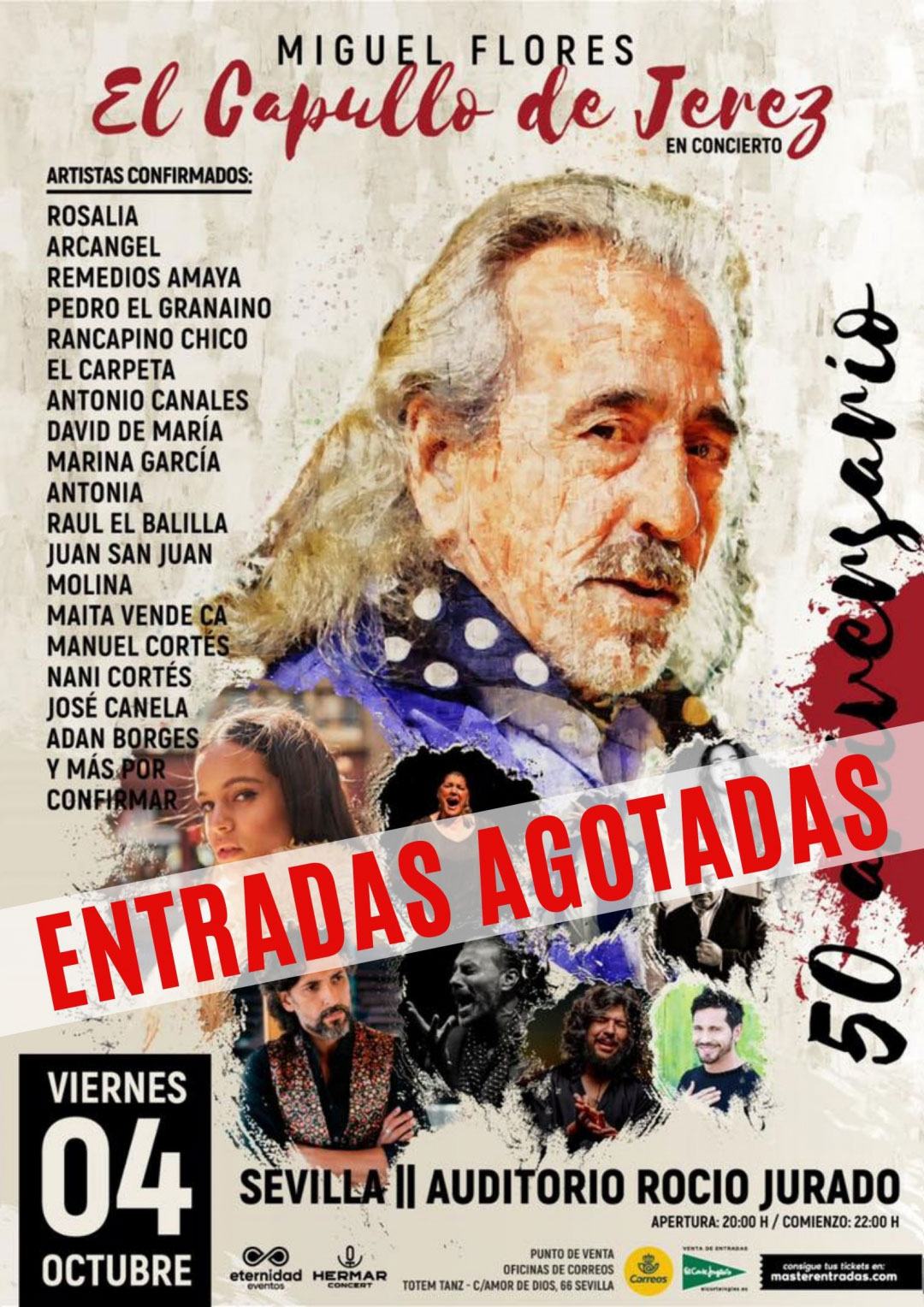 El concierto programado para el 4 de octubre en el que se celebra el 50 aniversario de Miguel Flores “Capullo de Jerez” en el Auditorio Rocío Jurado de Sevilla ha agotado sus entradas con más de un mes de antelación.