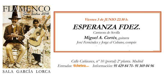 Este fin de semana, dentro del ciclo San Isidro Flamenco de la Sala García Lorca se darán cita -viernes 3 de junio- la cantaora trianera Esperanza Fernández acompañado por su guitarrista habitual Miguel A. Cortés. José Fernández y Jorge el Cubano al compás.