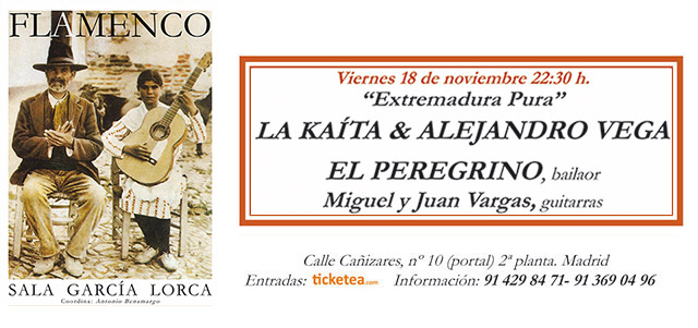 Este fin de semana, pasarán por la Sala García Lorca, viernes, el espectáculo de «Extremadura pura» con La Kaíta, Alejandro Vega, Miguel Vargas, Juan Vargas y el Peregrino y sábado el cantaor palentino Enrique El Pescao.