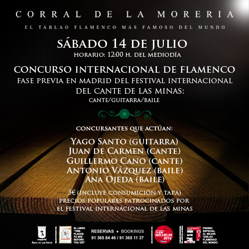 Durante el sábado 14 de julio, a partir de las 12:00 del mediodía, los concursantes mostrarán sobre el escenario sus propuestas intentando alcanzar la fase final del concurso flamenco más importante a nivel internacional. El guitarrista Yago Santos, el cante de Juan de Carmen y Guillermo Cano, y el baile de Antonio Vázquez y Ana Ojeda llegan a esta fase previa, teniendo como característica común formar parte ya de los principales exponentes del flamenco actual ¿Quienes conseguirán llegar a la fase final? Ven a comprobarlo el próximo sábado 14 de julio a partir de las 12:00 del mediodía. Entradas a 3 euros incluyendo 1 refresco o cerveza + 1 tapa, precio popular con el patrocinio del Festival Internacional de Cante Flamenco de Las Minas. Aforo limitado, reserva tus entradas antes de que se agoten en http://www.ticketea.com/festival-internacional-flamenco-las-minas—fase-previa-madrid