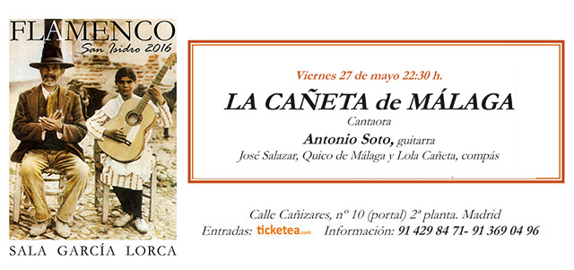 El viernes 27 de mayo, regresa también La Cañeta de Málaga, cantaora festera por definición, la veterana malagueña estará acompañada por la guitarra de Antonio Soto y el compás de José Salazar, Quico de Málaga y Lola Cañeta. Los 90 espectadores que consigan su entrada vivirán una velada única de cante flamenco por fiesta.