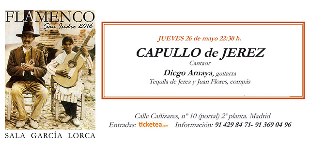Esta noche, 26 de mayo, Capullo de Jerez, con todas las entradas agotadas se presentará ante su público más fiel acompañado a la guitarra por Diego Amaya y Tequila de Jerez y Juan Flores al compás. Capullo de Jerez, repite en esta edición del ciclo San Isidro Flamenco y como en anteriores actuaciones los fans que llenarán la Sala Garcia Lorca disfrutarán de su cante en la versión más íntimo, sin micrófonos ni amplificación alguna.