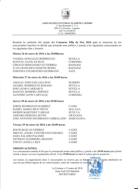 A lo largo de esta semana 20 cantaores pugnarán por alzarse con el prestigioso premio “Silla de Oro”. La entrada para el martes 26, miércoles 27, jueves 28 y viernes 29, días en los que se llevará a cabo la Fase de Clasificación, tendrá un coste de un euro. El sábado 30 la entrada para la fase final costará cinco euros. Todos los días el concurso dará comienzo a las 20:00 horas. Finalmente, el día de la final actuará el bailaor y coreógrafo José Maldonado acompañado en el cante por David Vázquez y ’El Trini’, Pino Losada en la guitarra y Kike Terrón en la percusión.