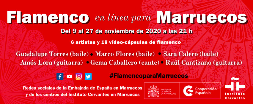 La Embajada de España y los Centros del Instituto Cervantes en Marruecos organizan, del 9 al 27 de noviembre, un programa artístico bajo el título “Flamenco en línea para Marruecos”. Con Guadalupe Torres, Amós Lora, Marco Flores, Gema Caballero, Sara Calero y Raúl Cantizano.