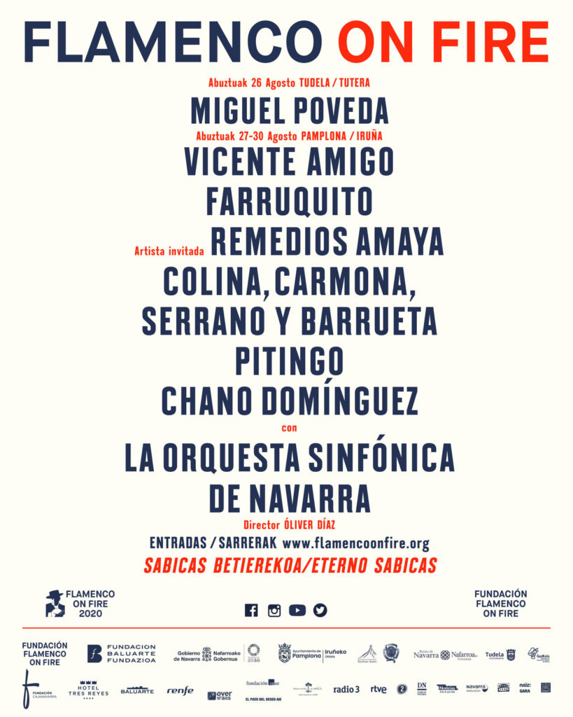 - Miguel Poveda, Vicente Amigo, Farruquito con Remedios Amaya, Pitingo y Chano Domínguez con la Orquesta Sinfónica de Navarra encabezan una lista de conciertos y actividades que tendrán lugar en Tudela y Pamplona/Iruña entre el 26 y el 30 de agosto.