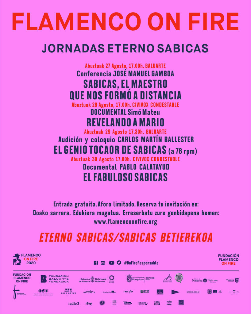 Las Jornadas Eterno Sabicas ahondarán en la figura del guitarrista navarro a través de la conferencia impartida el jueves de 27 agosto por José Manuel Gamboa, la audición de discos de pizarra y coloquio con Carlos Martín Ballester y la proyección del documental, El fabuloso Sabicas del director navarro Pablo Calatayud. Además, se proyectará el documental Revelando a Mario, sobre la figura fundamental para el flamenco del productor y fotógrafo Mario Pacheco, rodado en parte durante Flamenco On Fire 2019. Todas las actividades tendrán lugar del 27 al 30 de agosto en Baluarte y Civivox Condestable.