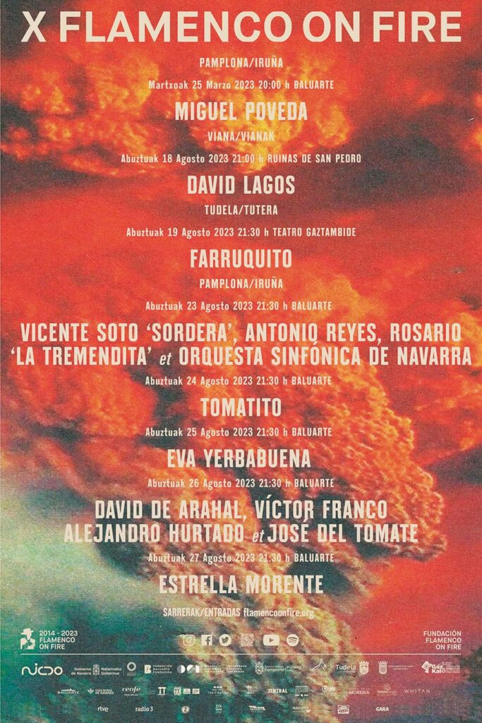 Nuestro décimo aniversario coincide con el centenario de Lola Flores, Fernanda de Utrera y Rafael Farina. La conmemoración del 75 cumpleaños de Paco de Lucía y 50 desde la publicación del emblemático disco Fuente y Caudal, en el que se incluía Entre dos aguas. También 50 de la muerte de Manolo Caracol y de Diego del Gastor, 10 años del fallecimiento de Juan Moneo ‘El Torta’ y 60 del primer álbum de José Menese, que grabó junto a Melchor de Marchena. Asimismo, el centro cultural La Casa de ‘Sabicas’ en Pamplona celebra también su décimo aniversario. Flamenco On Fire cumple años, pero a su celebración suma el resto de conmemoraciones. Por ello, este año suma un día más a su programación habitual de agosto y cuenta con dos producciones propias.