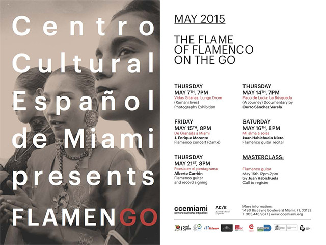 FlamenGo se inaugura con la exposición Vidas Gitanas. Esta exposición es un proyecto de la Fundación Instituto de Cultura Gitana y de Acción Cultural Española (AC/E) que viaja a la historia de los gitanos españoles dando a conocer su gran legado histórico artístico y sus numerosas influencias y aportaciones al patrimonio cultural de nuestro país. Casi un centenar de fotografías narran, en esta exposición gráfica, seis siglos de la historia de los gitanos españoles que se podrá ver desde el 7 de mayo con la inauguración a las 7pm, hasta el 24 de julio de 2015 en el CCE Miami.