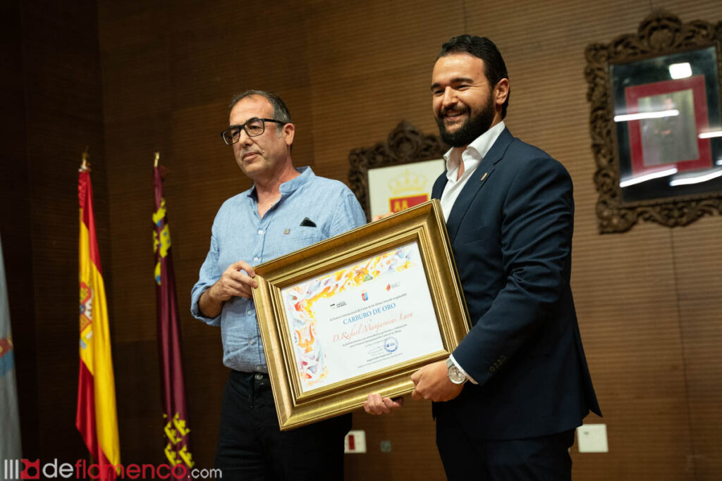 El carburo alumbraba al minero en la oscuridad de la galería. Del mismo modo, ocurre con la Cátedra de Flamencología de Córdoba y el periodista conquense, Rafael Manjavacas, dos pioneros que han iluminado el camino del flamenco en dos ámbitos tan dispares como el periodístico y académico. “Ser reconocidos por un festival de tanto prestigio nos da más oxígeno y aliento para continuar avanzando en esta labor”, afirmó David Pino, director de la Cátedra, que estuvo acompañado da Antonio Arenas, vicerrector de la UCO. Por su parte, Rafael Manjavacas quiso dedicar este premio a La Unión, “una ciudad que nos acoge desde el primer día y nos hace formar parte de la familia del Festival”.
