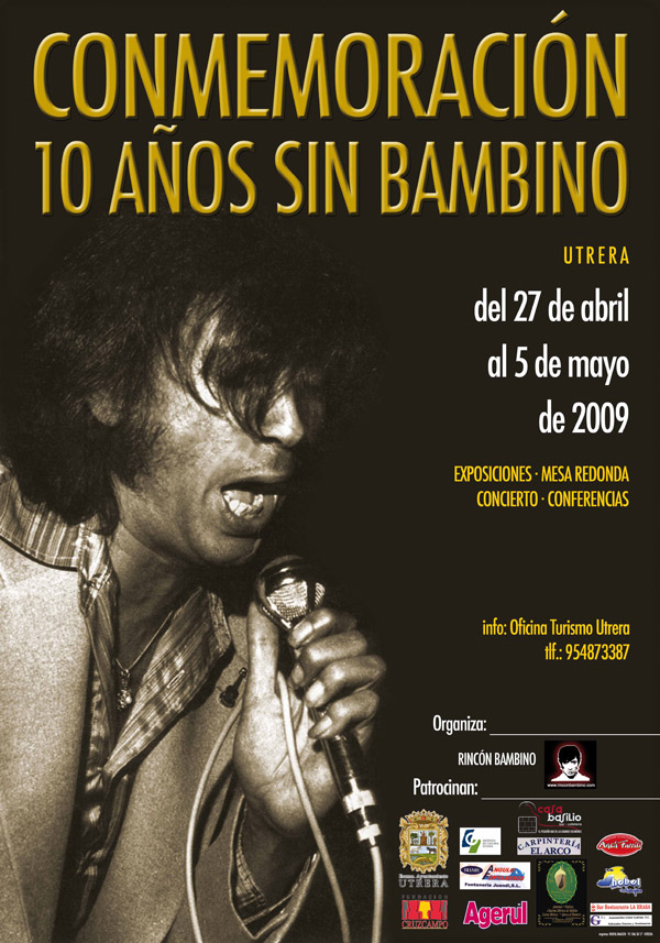 A través de la web Rincón Bambino, y con el patrocinio del Ayuntamiento de Utrera, se ha programado una serie de actividades culturales y actuaciones específicamente relacionadas con la figura del inmortal cantaor y cantante que revolucionó Madrid en los años sesenta con su personal manera de cantar por rumba y bulerías. Además de una exposición de fotos, vídeos, discos y objetos personales de Bambino bajo el lema “10 Años sin Bambino”, el día 29 ofrece la proyección de un vídeo “Bambino Siempre”, y una mesa redonda para tratar la figura del artista. El día 1 de mayo, tendrá lugar un recital irrepetible: de puntos tan desperdigados como Barcelona, Ibiza, Badajoz, Toledo o Málaga entre otros, llegará aficionados para cantar temas de Bambino. El día 2, el homenaje sigue en el Teatro Municipal con un acto que concluirá con la actuación de Manuel Amaya. Todo terminará el día 5 con una misa y entrega floral en el monumento a Bambino.