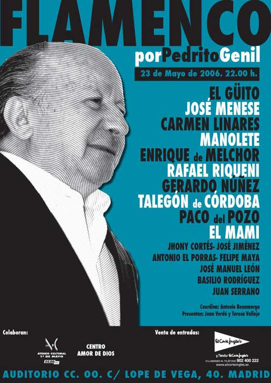 | Auditorio CC.OO. (C/ Lope de Vega, 40) – Madrid Martes, 23 mayo, 22.00h Precio entrada: 18-euros Venta entradas: EL CORTE INGLES: 902930120 Más información de Pedrito Genil en aireflamenco. |