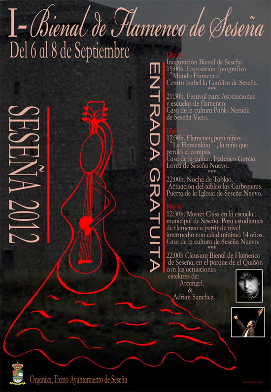 Además el Programa cuenta con una exposición fotográfica sobre el Arte Flamenco ubicada en el Centro Cultural Isabel La Católica de Seseña, una Máster Class de Flamenco, dos actuaciones nocturnas en unos escenarios al aire libre fantásticos como son la Plaza del Ayuntamiento de Seseña Nuevo, con la actuación del Tablao “Las Carboneras” y el Lago del Parque de “El Quiñón” en Seseña , con la actuación estelar de los bailaores “Arcángel y Adrián Sánchez”. El programa no deja de lado a los más pequeños e incluye además el espectáculo infantil “La Flamenkita”. En definitiva, todo un interesante programa para esta primera Bienal de Flamenco Seseña 2012.