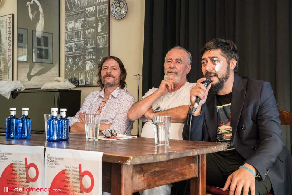 El percusionista Bandolero y Andrés Almada -‘Pato’-, artífices del proyecto, recibieron en Casa Patas a medios de comunicación y artistas con motivo de la presentación del III Festival Flamenco de Club que acogerá el Café Berlín los viernes y sábados del mes de noviembre. El acto fue encumbrado por el polifacético José Luis Ortiz Nuevo, bautizado por algunos como el ‘científico del flamenco’.