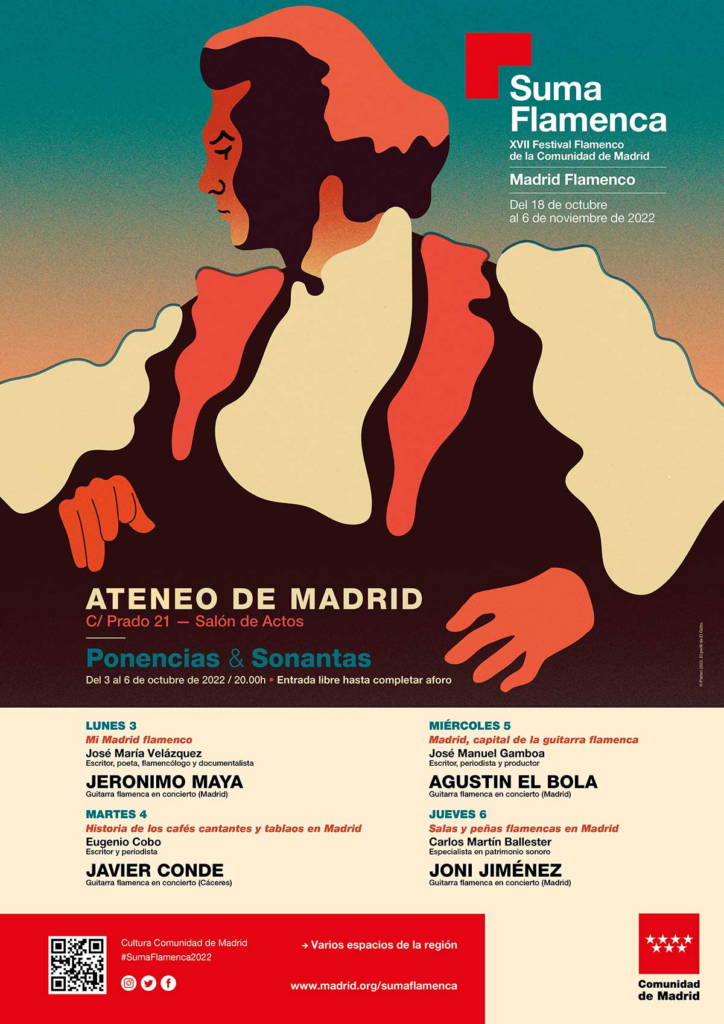 A partir del lunes 3 de octubre y hasta el día 6, el Ateneo acogerá el ciclo Sonantas & Ponencias, un recorrido detallado por diversos aspectos singulares del flamenco en Madrid a lo largo de la historia, lo que entronca con el lema que Suma Flamenca ha elegido para su edición de 2022: Madrid flamenco. Cada sesión se abrirá con una conferencia y concluirá con un concierto de guitarra de media hora.