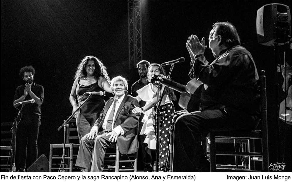 El fin de fiesta fue el broche a una noche impresionante, con la saga Rancapino compartiendo escenario, padre, hija y nieta y en donde la pequeña de la familia dedicó un cante a su abuelo, el maestro Alonso Núñez “Rancapino”, quien no podía evitar sonreír en todo momento mientras contemplaba a su nieta. A la celebración también se unieron Ana Rancapino, el maestro Paco Cepero, Keko Baldomero al toque, Manuel de Cantarote y José Peña a las Palmas y Ramón Torres Núñez en percusión, quienes fueron ovacionados, con el público en pie, al final de la actuación.