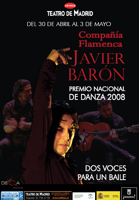 TEATRO DE MADRID JAVIER BARÓN. PREMIO NACIONAL DE DANZA 2008, en la modalidad de Interpretación, por su aportación al flamenco desde la danza española y por su dedicación a la investigación de estéticas en el flamenco desde la ortodoxia y el conocimiento de este arte. DOS VOCES PARA UN BAILE Con Dos voces para un baile, Javier Barón quería un espectáculo que fuera libre y vivo y esencial. Este era el reto: un traje sin costuras, un edificio transparente. La apuesta era exigente, pero muy atractiva. Nada más difícil que desaparecer y estar presente a un tiempo, nada más complejo que la sencillez. Por ello, hemos diseñado una puesta en escena “invisible”, que nunca reclama un protagonismo que no le corresponde en este caso y que, sin embargo, acompaña cada baile, cada cante como un enamorado, como un primer espectador y lo coloca allí donde alcanza su plenitud. “Hay momentos en la vida de un artista en que se detiene y echa una mirada atrás, al que ha sido, para poder entender mejor al que es y, así, seguir creciendo. Eso hace Javier Barón en Dos voces para un baile. Y el resultado es un ejercicio de desnudez, de despojamiento de su baile y de los elementos que lo rodean, para quedarse con el tuétano. Y el tuétano es la música y las voces y el ritmo. Dos guitarras cómplices y luminosas, el compás preciso y versátil y dos cantaores extensos, generosos y en estado de gracia. Sólo eso. Eso y el baile de Barón. Un baile clásico y arriesgado, exacto y libre, que transita por todo el repertorio flamenco con igual entrega y brillantez: de la farruca a los tangos, de las alegrías a la seguiriya, de la soleá a las bulerías. Todo fluye, como una conversación, como una improvisación inspirada y gozosa. Dos voces para un baile es un regalo, la obra de un artista que, en su madurez, prescinde de ornamentos y atajos y nos entrega su verdad más esencial”. David Montero ELENCO ARTÍSTICO BAILE JAVIER BARÓN TEATRO DE MADRID