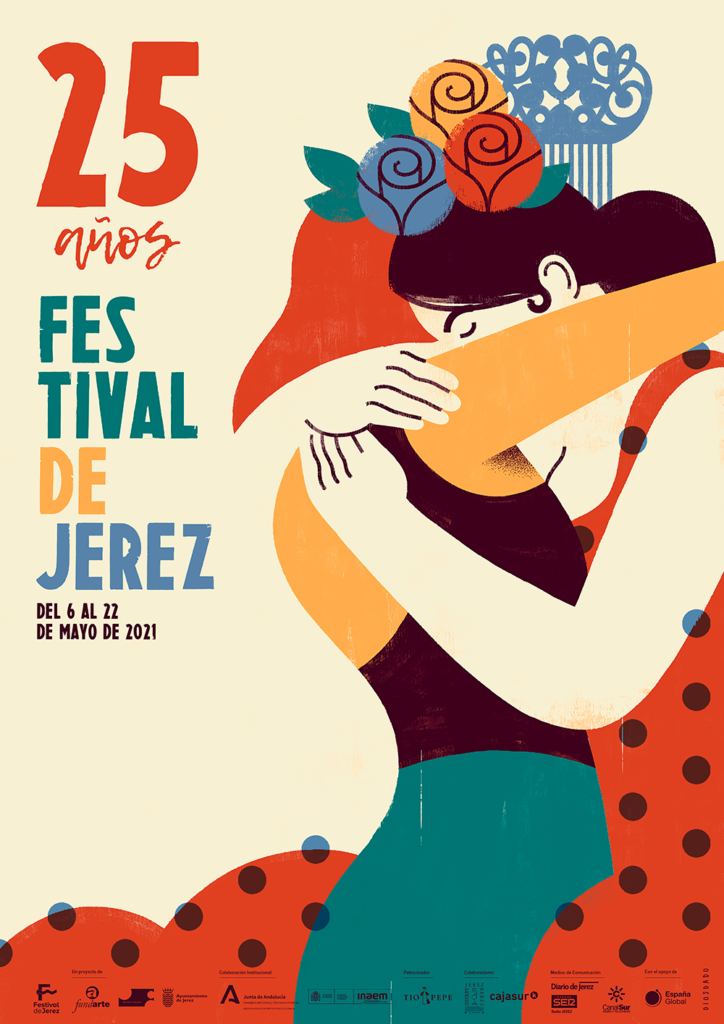 Esta 25ª edición no solo es especial por significar las “bodas de plata” de la cita sino porque, tras los meses de distancias y ausencias, es una invitación a disfrutar del reencuentro con lo que amamos y a restaurar los vacíos en los entornos artísticos con total seguridad. Los parámetros actuales marcan, por tanto, una edición en la que el Festival de Jerez quiere definirse no solo como un evento cultural de referencia, sino como un acto de amor y agradecimiento a los artistas que dedican su vida a compartir su talento y al público que acude a las salas para aplaudirlo; amor y agradecimiento que se trasmite a través del abrazo representado en el cartel de este año, obra de Daniel Diosdado.