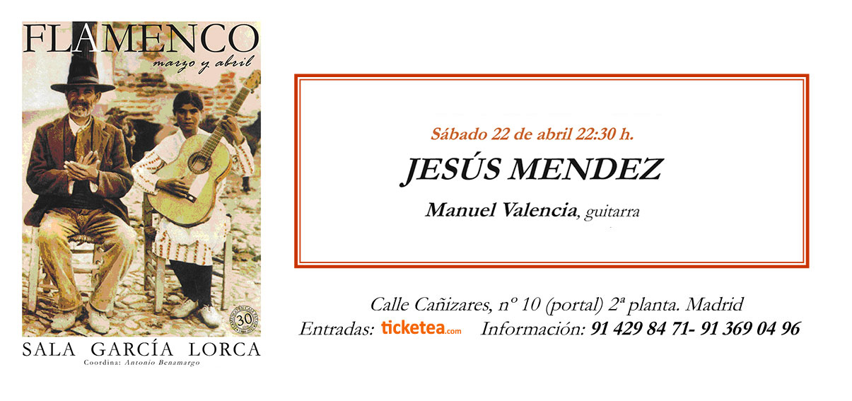 Nace en el seno de una de las sagas de cantaores más importantes que ha dado Jerez, la de los Méndez, cuyo buque insignia fue La Paquera de Jerez. Su carrera comenzó a los diecisiete años, momento en el que decidió subirse a un escenario para probar suerte. Desde su debut, en el año 2002, en la Asociación Cultural D. Antonio Chacón de Jerez, el joven cantaor jerezano ha trabajado con artistas de la talla de Moraíto Chico, El Güito, Rocío Molina, Alejandro Granados, María del Mar Moreno y Carmen Cortés, entre otros… Defensor a ultranza de los cantes de La Plazuela e identificado con la bulería y la soleá, su crecimiento artístico ha sido cuantitativo en los últimos años. En esta parcela ha tenido mucho que ver el guitarrista Gerardo Núñez, su principal valedor. Con el genial tocaor, Jesús Méndez ha recorrido el mundo entero, desde Asia a Europa pasando por África y América, es decir, desde Nueva York a Pekín o desde Amberes a Chicago. De cualquier forma, la vida profesional del artista jerezano también va de la mano de nombres como Moraíto Chico, con quien ha compartido cartel en diversos escenarios y sobre todo de la bailaora Mercedes Ruiz, con la que ha perfeccionado el cante de atrás. En el año 2008 presentó su primer trabajo discográfico, ‘Jerez Sin Fronteras’, una obra auspiciada por el sello Gallo Azul de Gerardo Núñez y que ha contado con la colaboración de artistas como Moraíto, Diego del Morao o Santiago Lara. Asimismo, el compacto recibió el Premio Nacional de la Crítica al mejor Disco Revelación. En 2011, se presenta en el Festival de Nîmes con su recital propio. Participa a la última creación de Belén Maya TR3S y La pasión según se mire de Andrés Marín, que se presentan en Nîmes, Amiens, Créteil, y el Théâtre National de Chaillot. En 2012 participa como artista invitado en el espectáculo Viva Jerez y en la producción Vinática de la bailaora Rocío Molina. También interviene en la Zarzuela De Sevilla a Triana en el Teatro Arriaga de Bilbao. Presenta su segundo álbum “Añoranza” en la Bienal de Flamenco de Sevilla et en Jerez, acompañado por El Torta, Miguel Poveda, Manuela Méndez como artistas invitados. Recorre España en 2012 y 2013 para presentar este trabajo. En Febrero de 2013, participa al estreno de FIESTA DE LA BULERÍA, durante el ciclo GITANOS ANDALUCES de la Cité de la Musique de Paris. 2014: presenta en el ciclo FLAMENCO VIENE DEL SUR un recital con el guitarrista Manuel Valencia, entre otros. También es artista invitado en el espectáculo Op. 24 de Andrés Marín. En julio, participa en el Festival de Aviñón, cantando en Oración, una creación de los compositores árabes Fawaz Baker (sirio), Amir El Saffar (iraquí-americano) y Ahmed Essyad (marroquí) que mezcla la saeta flamenca con la música árabe contemporánea. Se produce en la Bienal de Flamenco de Sevilla con el espectáculo Cantaores, compartiendo escenario con el cantaor Antonio Reyes. También interviene en el concierto de la pianista Ariadna Castellanos.