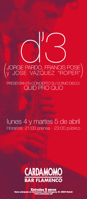 Lunes 4 y martes 5 en la Sala Cardamomo (C/ Echegaray, 15), Jorge Pardo junto con Francis Pose y José Vazquez 'Roper' presentan su nuevo proyecto d'3 en un disco llamado Quid Pro Quo.