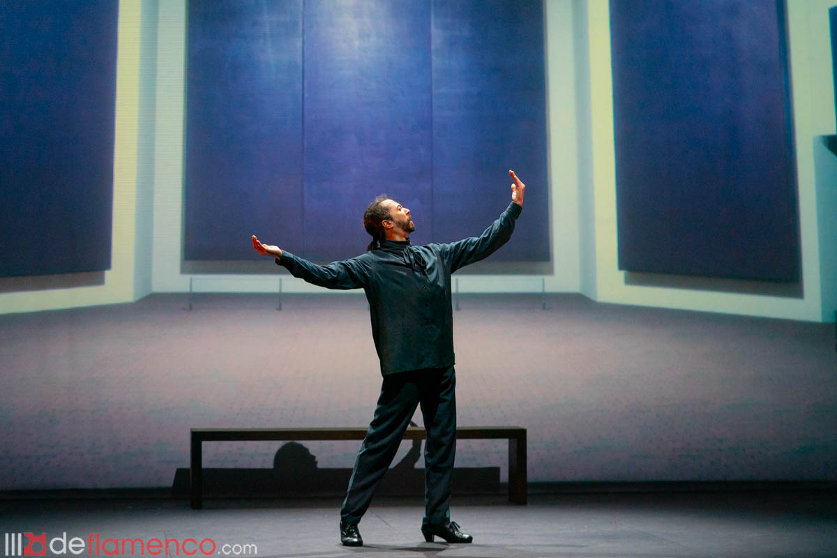 Unas proyecciones digitales monumentales nos trasladan desde la capilla de Rothko a una serie de paisajes abstractos y oníricos. Al ritmo de sus pasos, el bailarín nos guía por la profundidad de los colores. Poco a poco van creando los relieves y tintes de estos paisajes con horizontes infinitos. La naturaleza es a veces dramática, oscura e incandescente al ritmo de una soleá exaltada, a veces suave y espiritual cuando se canta una alegría aérea.
