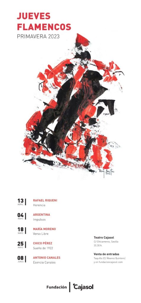 En esta ocasión, el veterano diseñador Toni Benítez, gran aficionado a los Jueves Flamencos, ha sido el encargado de crear el cartel del ciclo, inspirándose en la bailaora Manuela Vargas. Su trabajo es el resultado de los múltiples apuntes tomados al natural, durante la celebración de los espectáculos del Jueves Flamencos, a lo largo de los años.