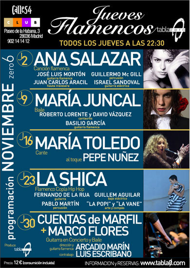 La pasada semana se abrió un nuevo ciclo flamenco, en Calle 54, uno de los locales de moda de la capital madrileña. El bailaor Joaquín Ruíz fue el encargado de su inauguración y ahora se presenta la programación para el mes de noviembre. La cantaora y bailaora Ana Salazar, la bailaora María Juncal, la cantaora María Toledo, propuestas arriesgadas como La Shica o la guitarra y el baile combinado de la mano de Arcadio Marín junto a Marco Flores.