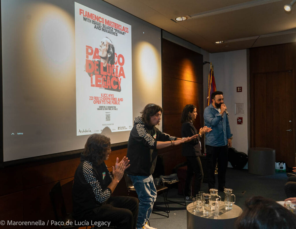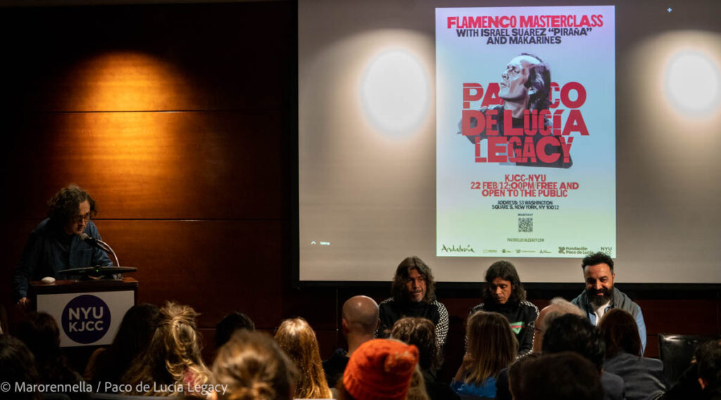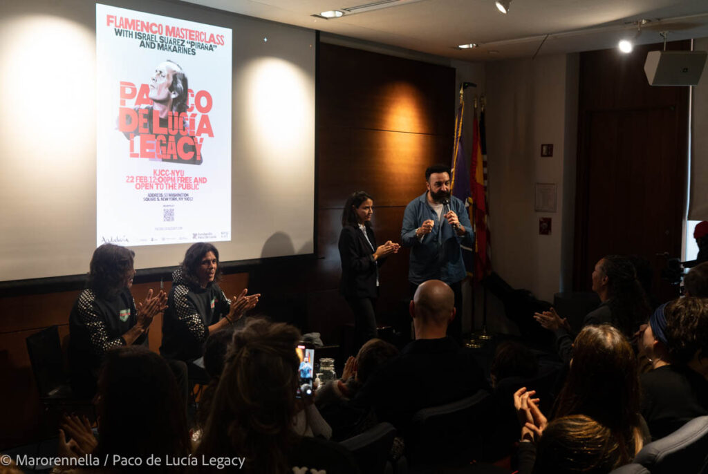 Otra prueba de ello se produjo en la sesión de mediodía, cuando Israel Suárez ‘Piraña’, último percusionista del grupo de Paco de Lucía, brindó una clase magistral de compás en un abarrotado salón del King Juan Carlos Center de la Universidad de Nueva York (NYU), acompañado por las palmas del dúo Makarines, conocidos por ser los acompañantes habituales en las giras de Rosalía.