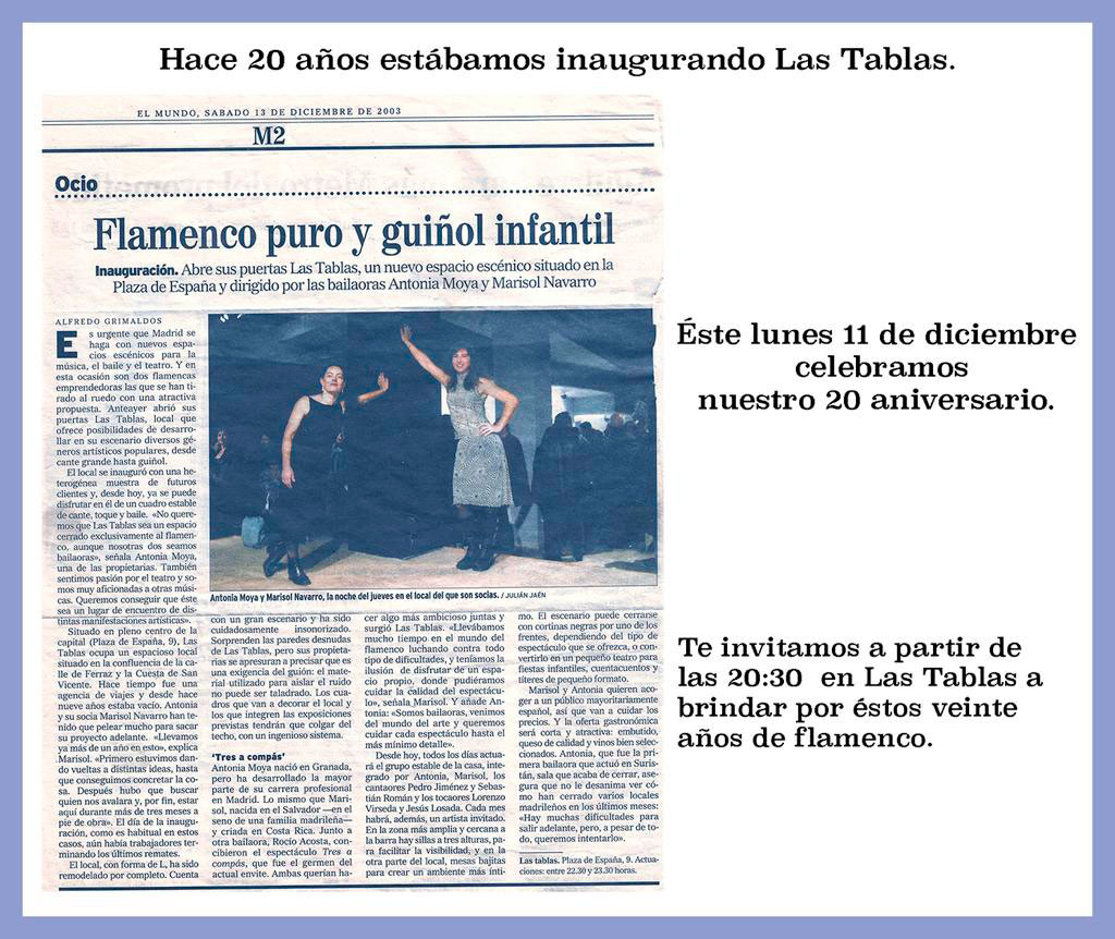 Este año se cumplen dos décadas desde que el Tablao Las Tablas abrió sus puertas por primera vez en el número 9 de la Plaza de España de la capital. El próximo 11 de diciembre se viste de fiesta para celebrar la efeméride de su XX aniversario.