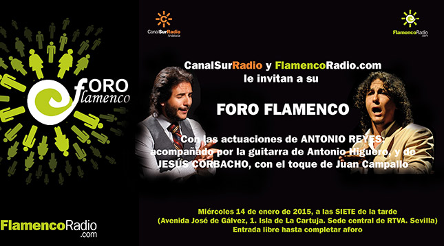 Este Foro Flamenco se celebrará en el plató de Canal Sur Radio, en la Isla de La Cartuja, el miércoles 14 de enero, a las siete de la tarde, y se emitirá en directo por internet, en streaming, contactando con la dirección electrónica que podrán encontrar en la web de Canal Sur. La entrada es libre hasta completar aforo.