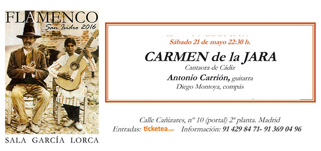 El ciclo “Flamenco en San Isidro” de la Sala García Lorca continúa este fin de semana con dos figuras del cante, en primer lugar, el viernes 20 de mayo Manuel Moneo, patriarca de la saga de los Moneo del barrio de la Plazuela. El sábado será el turno para la cantaora gaditana Carmen de la Jara, que representante el decir de los cantes de la Bahía. Vendrán acompañados a la guitarra por Miguel Salado el primero y por Antonio Carrión la cantaora gaditana. Dos figuras del cante flamenco muy difícil de ver en los escenarios, por lo que constituye una oportunidad única para los aficionados de Madrid.