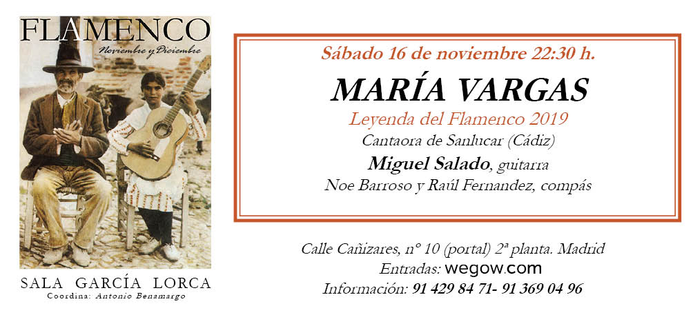 La veterana cantaora de Sanlúcar de Barrameda María Vargas ofrecerá un recital de cante flamenco en la Sala García Lorca de Madrid este próximo sábado 16 de noviembre, Día Mundial del Flamenco acompañado a la guitarra del jerezano Miguel Salado y el compás de Raúl Fernández y Noe Barroso.